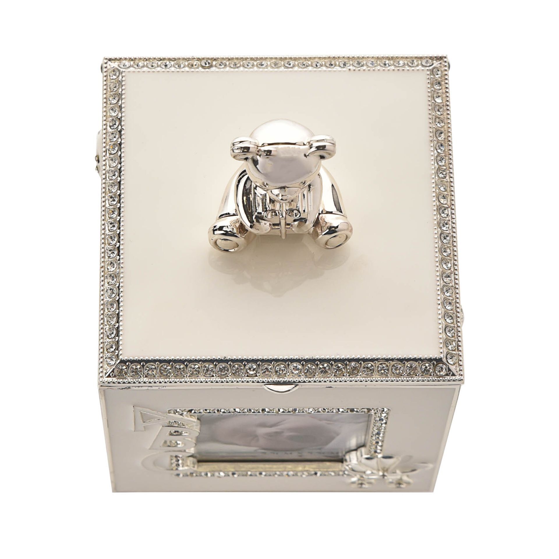 The real silver plated box features an adorable teddy bear, atop of crystal surrounded apertures on each side which showcase additional solid metal decorations upon its matching stand. The music box plays a soothing rendition of ‘Rock A Bye Baby’ when wound up and its hinged lid opens to a smooth, black velveteen lining, in which to store precious keepsakes.