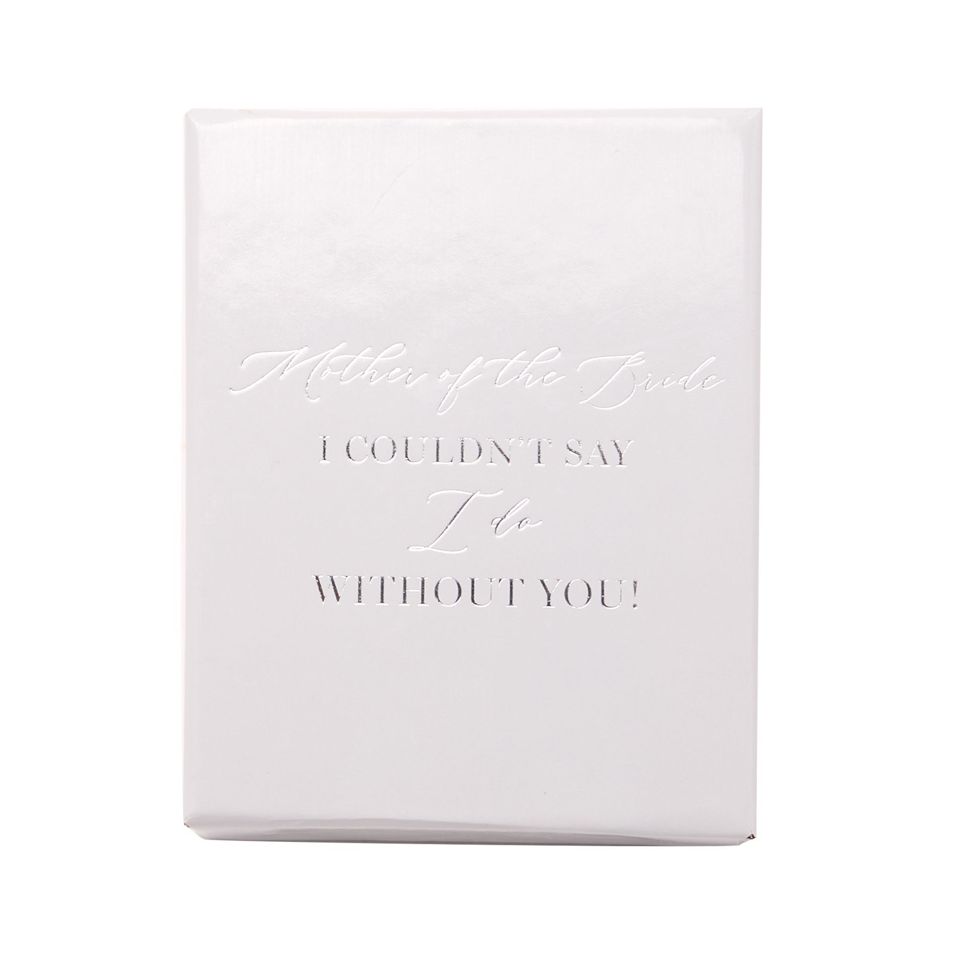 A Mother of the Bride charm keyring by AMORE BY JULIANA®. This heartfelt accessory is a loving way to say Thank You to those who make wedding days extra special. The silver metal keyring showcases a smooth finish heart with ‘Mother of the Bride’ engraving. It is finished by two further heart charms. The keyring is packaged in a gift box.