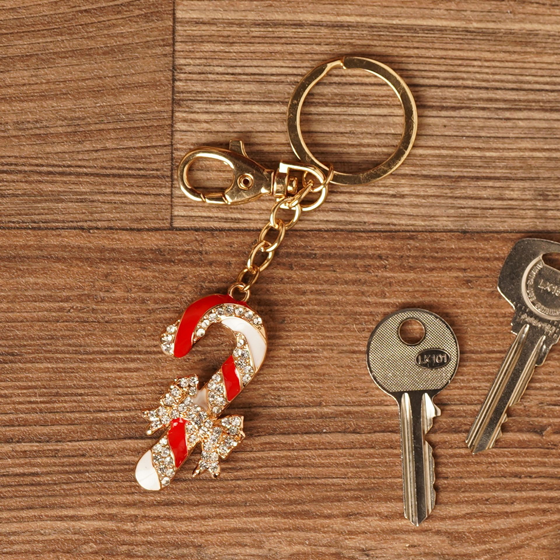 The image depicts a decorative keychain or charm in the shape of a candy cane, featuring a red and white striped design with rhinestone accents. Its sparkling crystals and classic colour palette bring a cheerful, modern edge to everyday essentials.