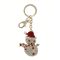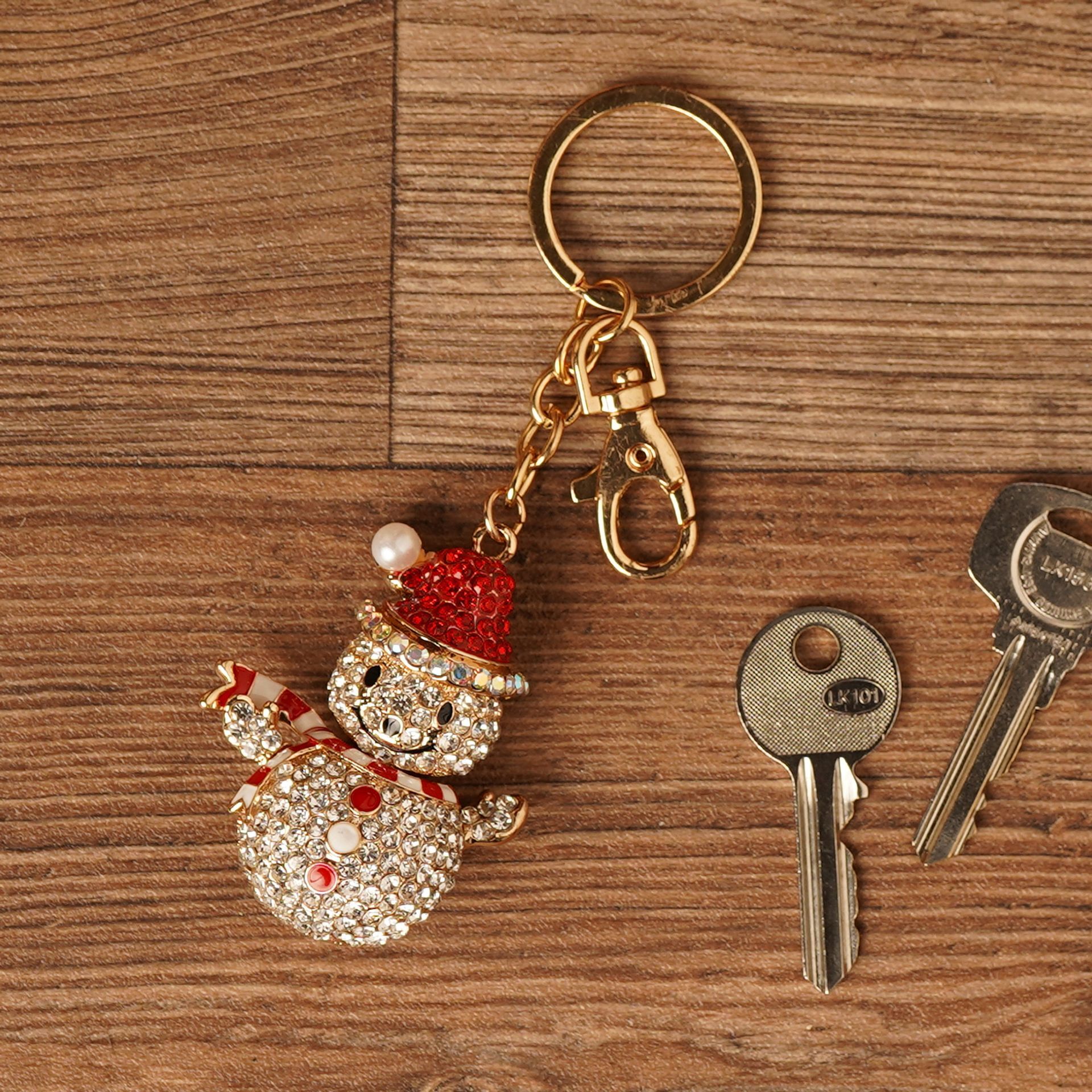 A sparkling, bejeweled snowman keychain with a red hat and scarf, hanging on a metal ring. The playful character is brought to life with crystal accents and a pop of cheerful colour, making it a standout piece for the holidays.