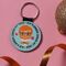 A round keychain features a cartoon-style illustration of a cheerful person with glasses, set against a pink background with glittery accents and a festive text message. The PU finish adds a subtle sheen, enhancing its sweet, nostalgic charm.