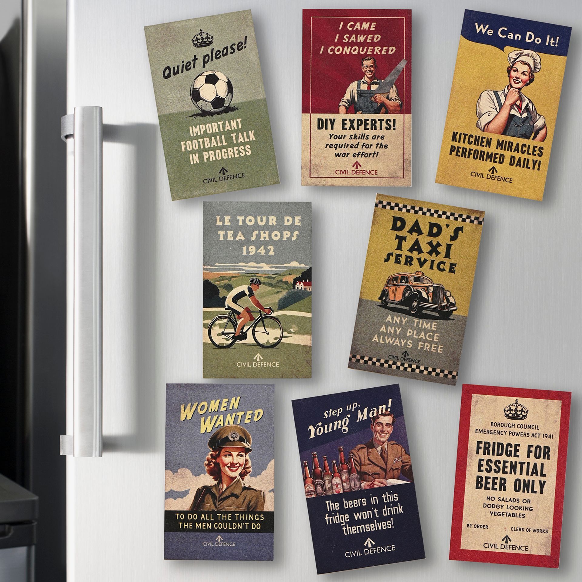 Celebrate history with humour through our Civil Defence Magnet Collection - a nostalgic range of vintage-style fridge magnets inspired by classic wartime campaigns. Each design features bold slogans, charming illustrations, and a lighthearted take on everyday life, from domestic duties to family roles and workplace wit. Whether for a history buff, retro enthusiast, or just someone who loves a good laugh, there’s a magnet perfect for brightening up fridges, notice boards, or any magnetic surface. Great for gifting on Father’s Day, Mother’s Day, birthdays, or just because - these quirky magnets are sure to raise a smile.