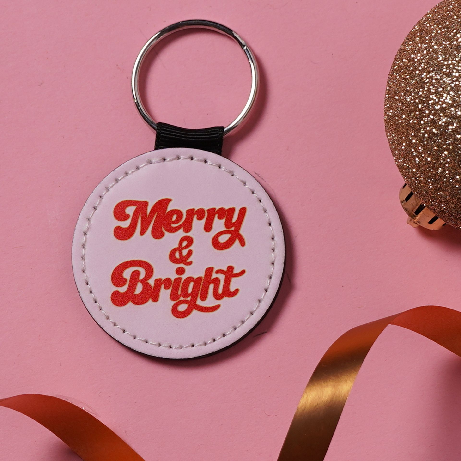 A white circular keychain features the phrase "Merry & Bright" in bold red lettering, complemented by a gold glittery detail for a touch of seasonal sparkle. The smooth PU leather finish adds a contemporary feel to this cheerful piece.