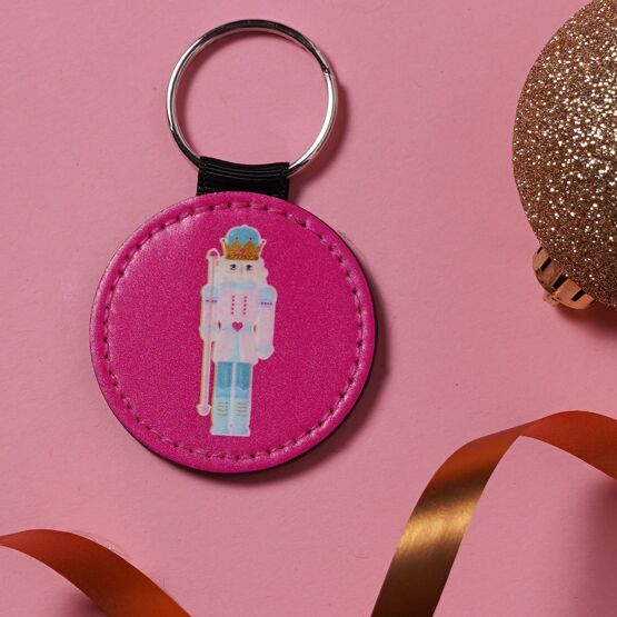 A pink circular keychain features a charming illustration of a nutcracker figure at its centre, highlighted with gold glitter accents for a festive touch. The smooth PU leather finish adds a modern, tactile element to this cheerful piece.