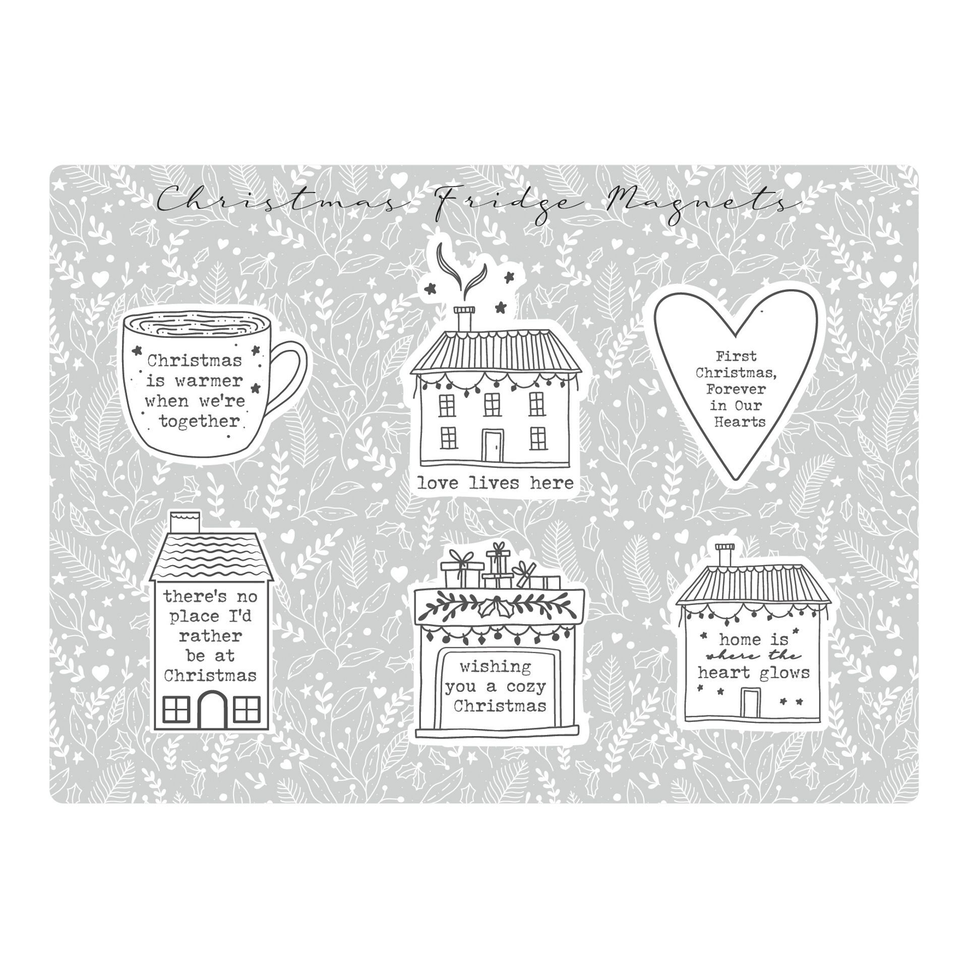 Each magnet is crafted from wood and features delightful Christmas-themed illustrations, including a cosy house, a steaming mug, and decorative hearts, all rendered in gentle, nature-inspired colours. The included display stand provides a neat and inviting presentation.