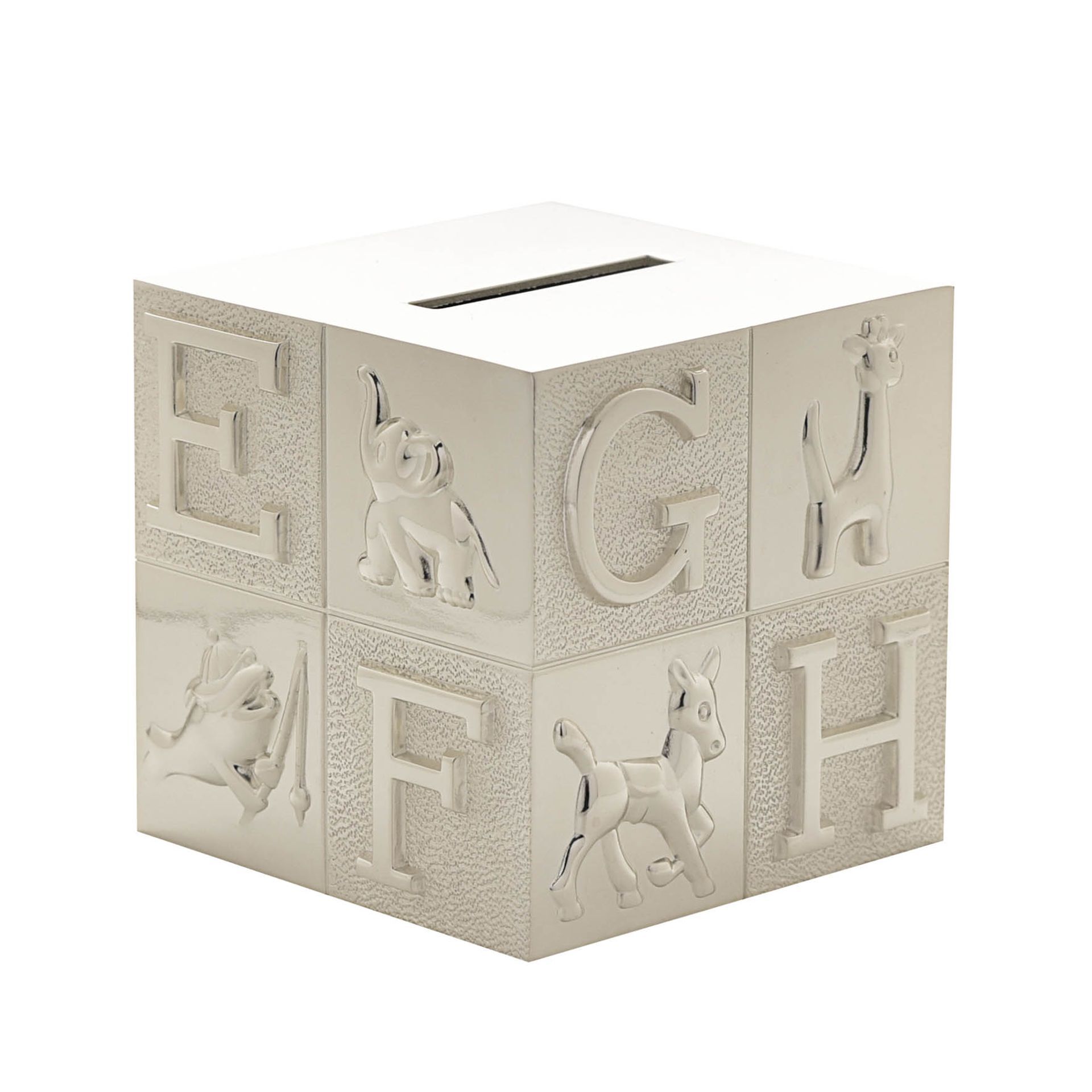 A silver plated ABC cube money box from BAMBINO BY JULIANA®.