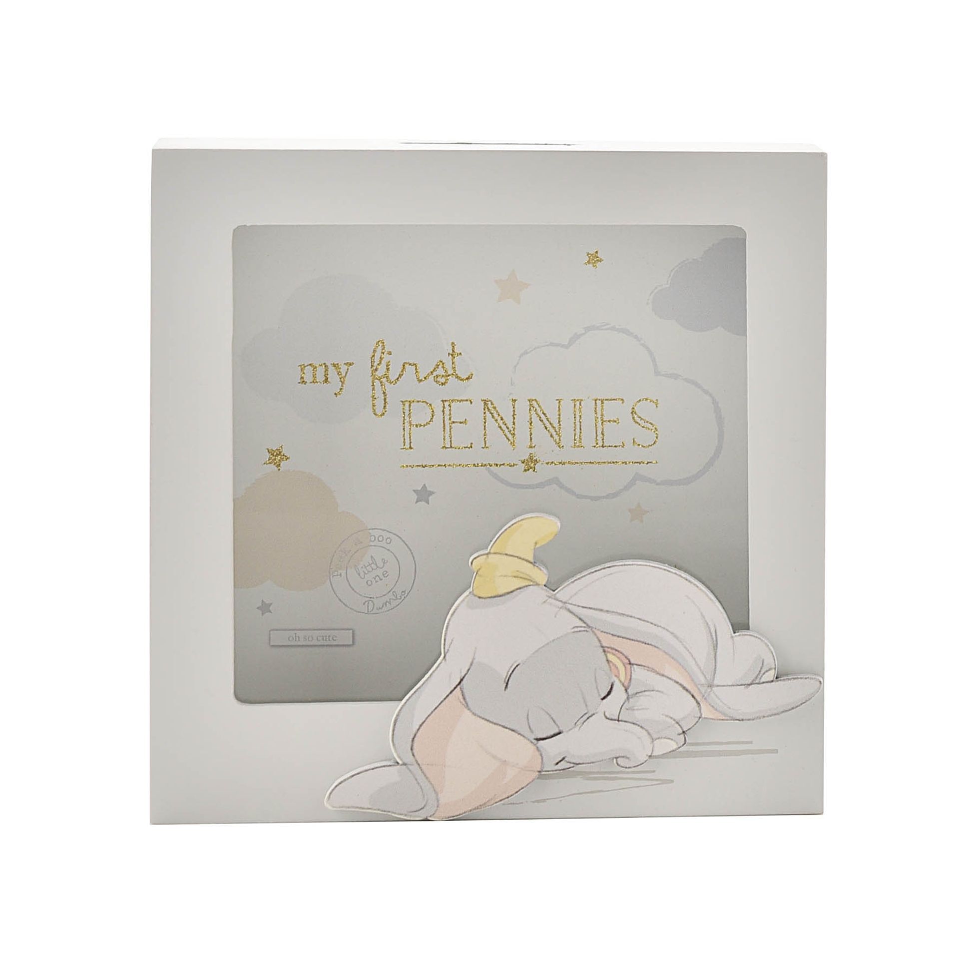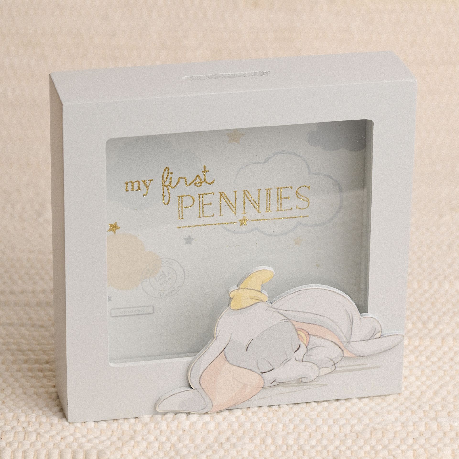 The wooden window box features a grey paint finish, completed by a loveable pencil style illustrated of Dumbo sleeping, along with a coin slot at the top. On the removable back panel is a ‘My first pennies’ sentiment in gold glitter lettering, finished with a pastel-coloured clouds and stars backdrop.