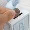Insert coins or folded notes throught the slot on the top and remove through the rubber stopper on the base.