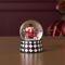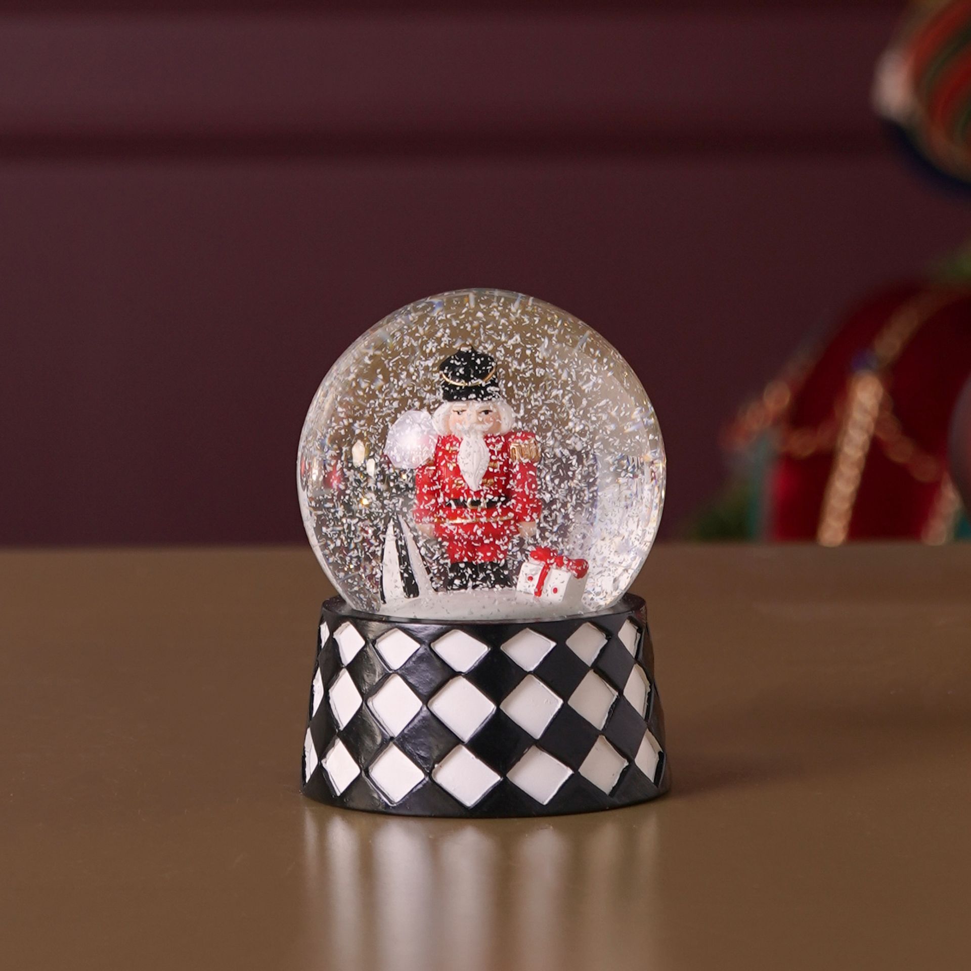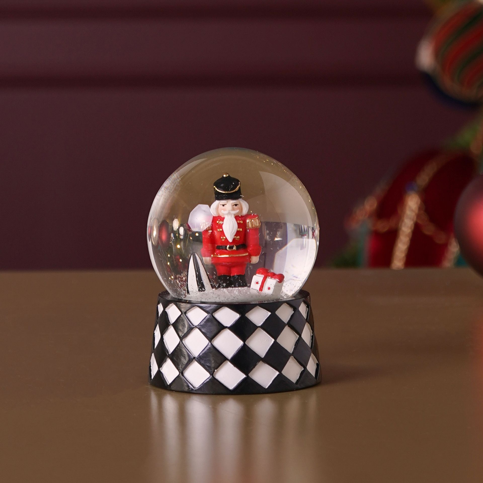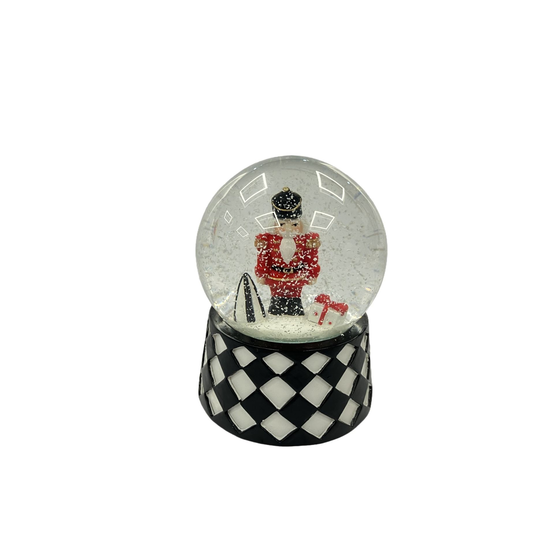 A snow globe containing a figurine of a toy soldier in a red uniform, standing on a black and white checkered base. The clear glass dome highlights the crisp colours and playful harlequin pattern, adding a refined touch to seasonal displays.