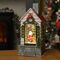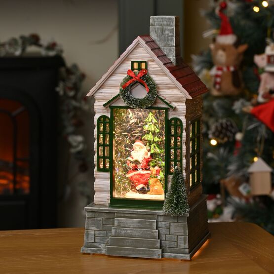This house-shaped decoration features a wreath on the front, a Santa Claus figure visible through the window, and a small Christmas tree in the background. Warm LED lighting and music create a welcoming ambience, perfect for shelves, mantelpieces, or window displays. Requires 3 x AA batteries (not included).