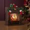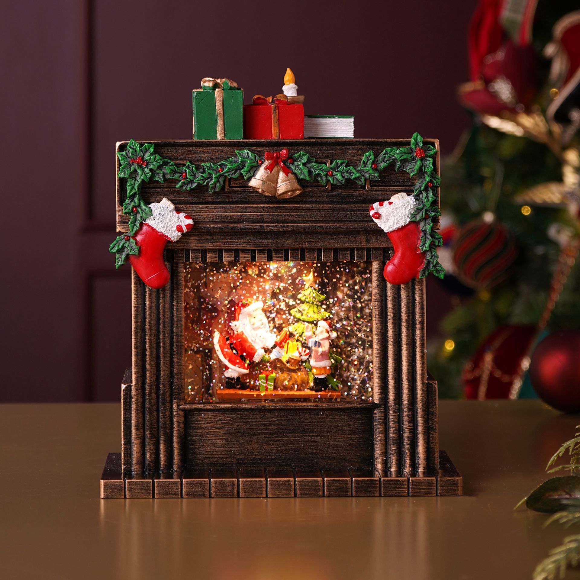 A festively decorated wooden fireplace mantel features a snow globe scene with Santa Claus and other seasonal characters, surrounded by wrapped gifts, candles, and holly leaves. Warm LED lights illuminate the intricate details, adding a gentle glow to the display.