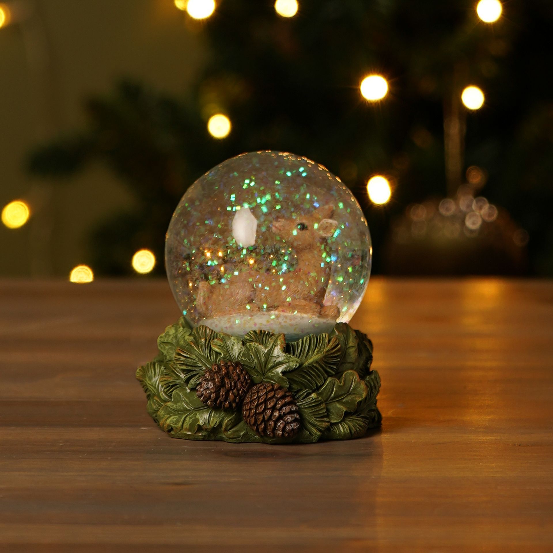 The Resin Deer Snow Globe with Natural Leaf Base captures a serene woodland scene in a festive accent.