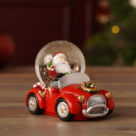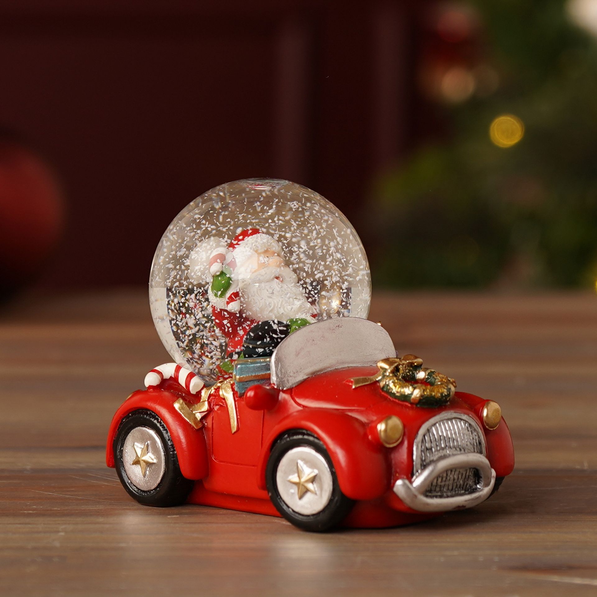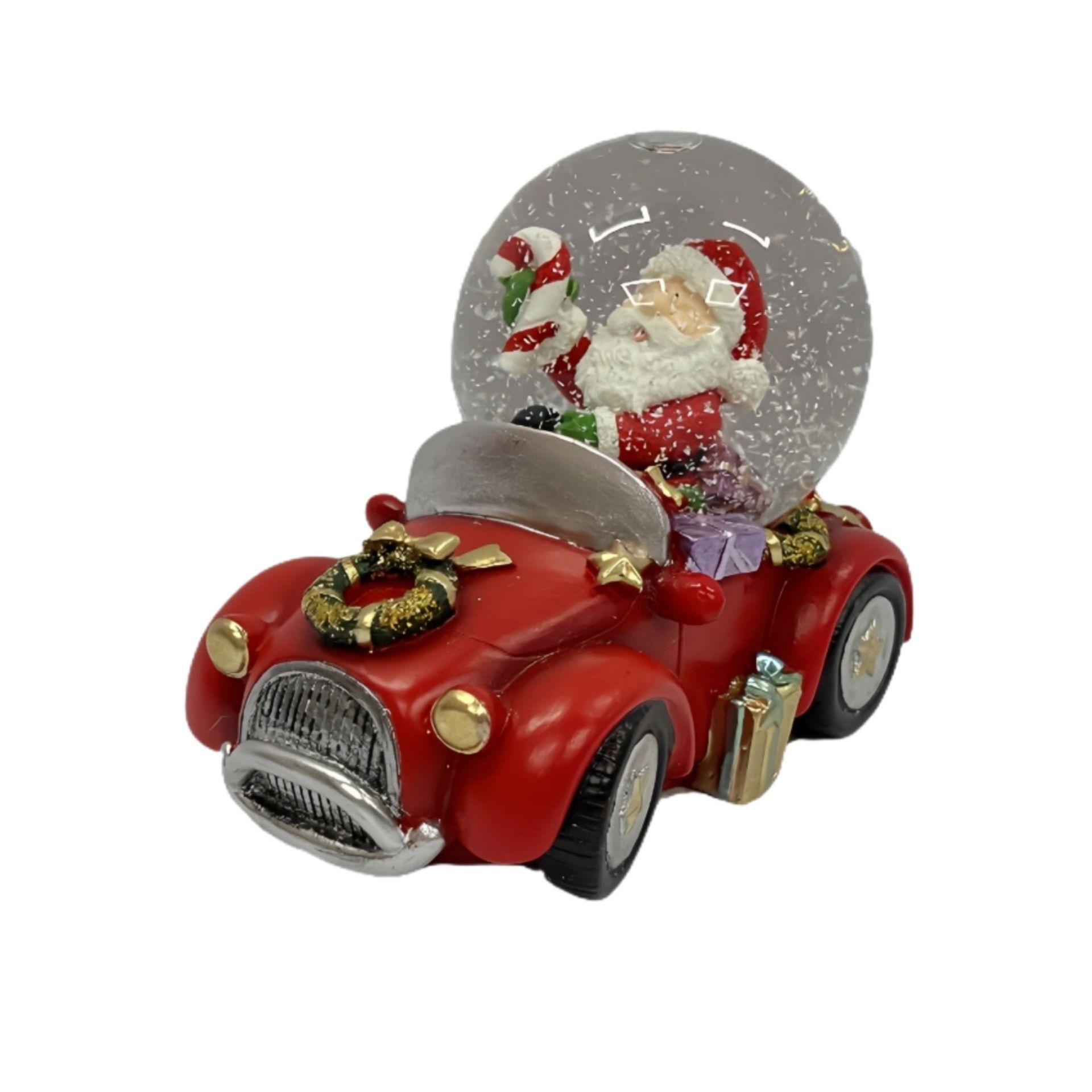 A red vintage car carries a cheerful Santa Claus inside a clear snow globe, surrounded by miniature festive decorations. The glossy finish and vibrant colours add a lively accent to any seasonal arrangement.