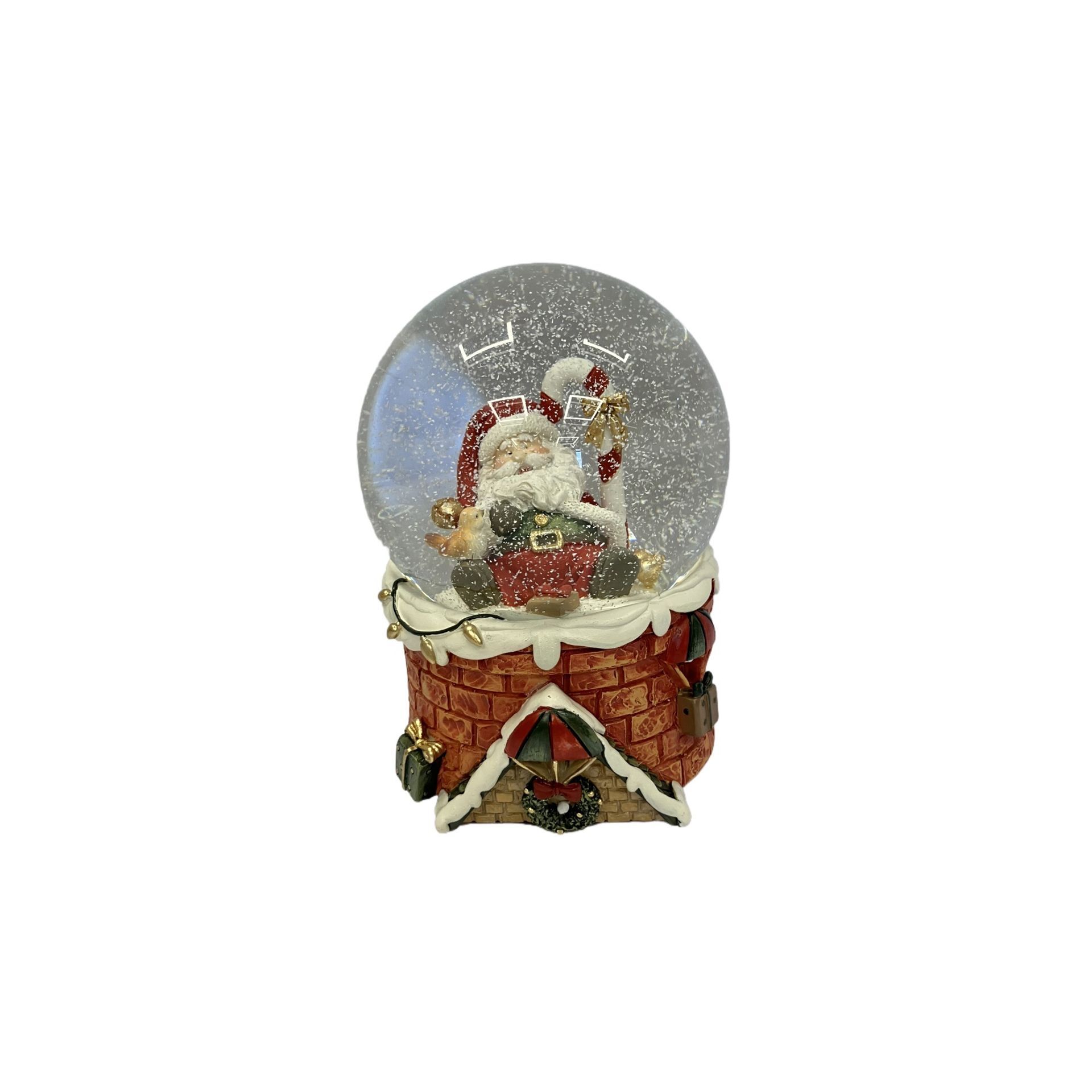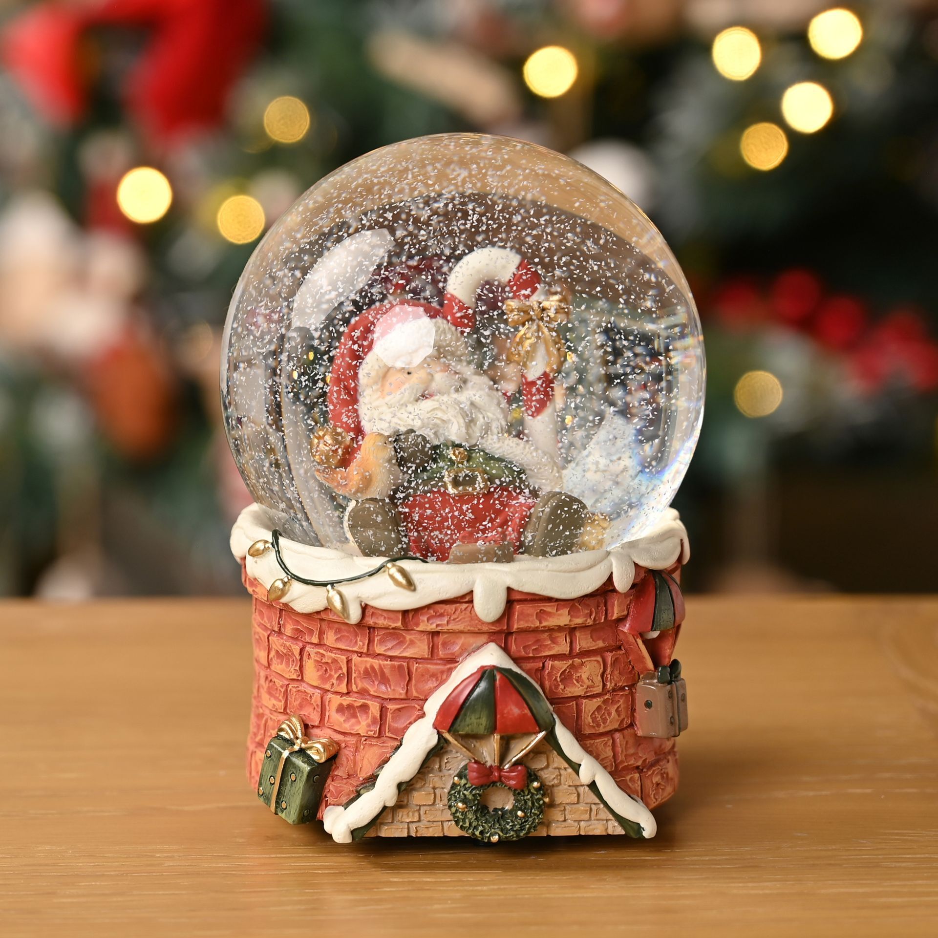 Inside the glass globe, Santa stands atop a brick chimney, surrounded by a snowy landscape, a decorated Christmas tree, and festive accents. The wind-up mechanism plays a traditional tune, adding sound to shelves or mantelpieces.