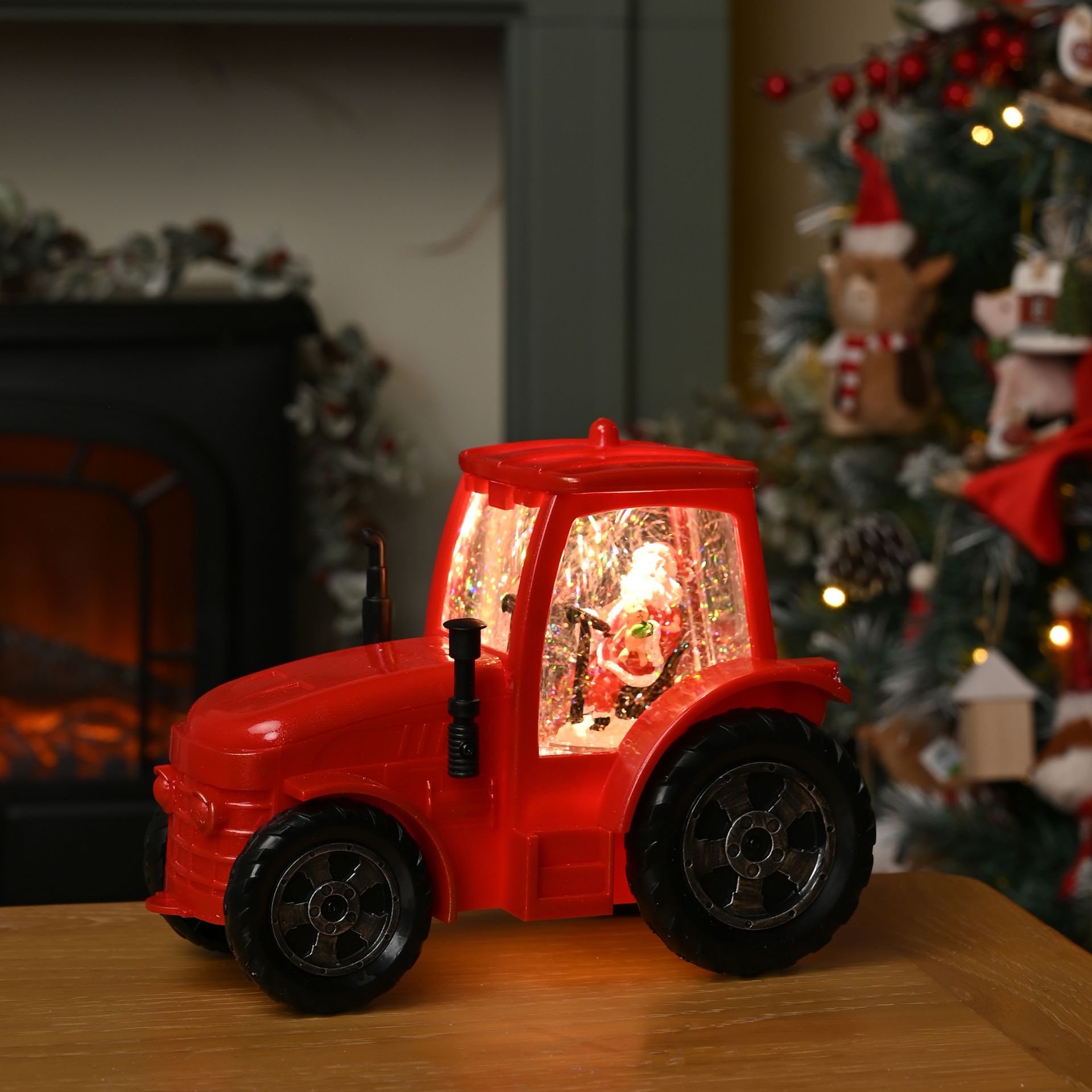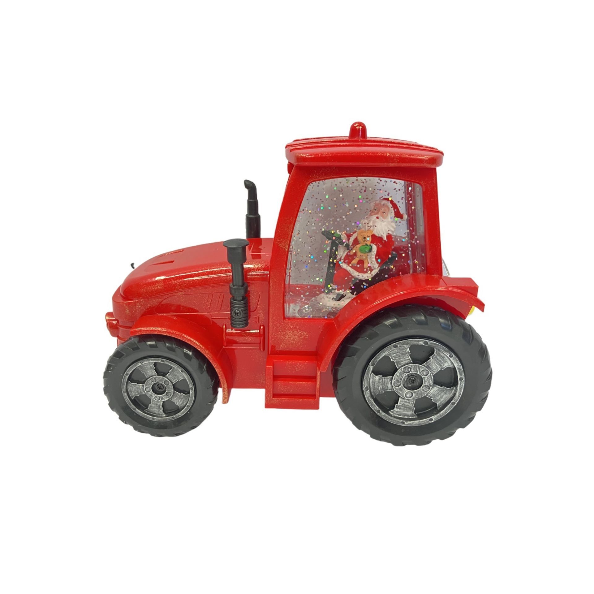 A bold red toy tractor carries a Santa Claus figure inside a snow globe at the front, blending nostalgic rural motifs with a touch of winter magic. The LED lights and musical feature create a cheerful focal point for shelves, windows, or mantelpieces. Requires 3 x AA batteries (not included).