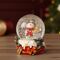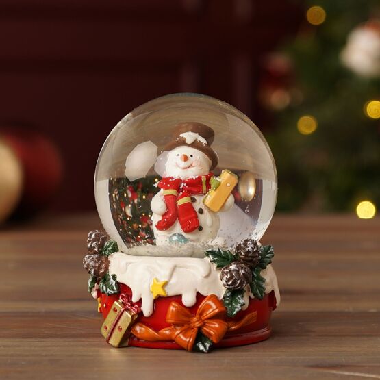 A snow globe containing a cheerful snowman figure, surrounded by a festive scene with holly, presents, and a snowy background. The water ball is finished with crisp seasonal colours and a touch of whimsy, making it a standout piece for modern Christmas decor.