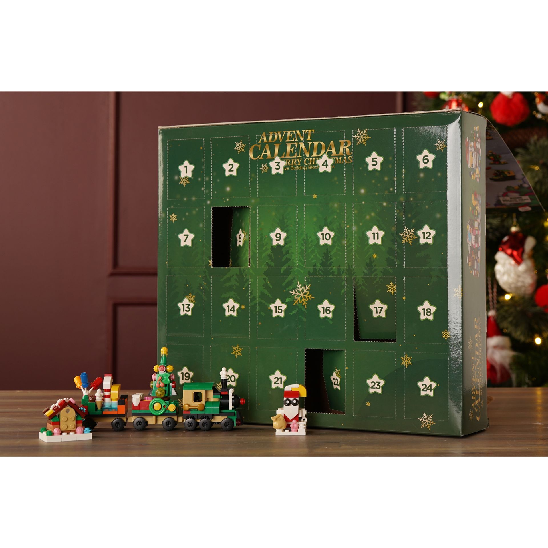 This 24 door advent calendar offers a unique way to countdown to Christmas, with Christmas-themed scenes to create like a train, houses, and festive decorations. Each vibrant block forms cheerful holiday vignettes, inviting playful creativity.
