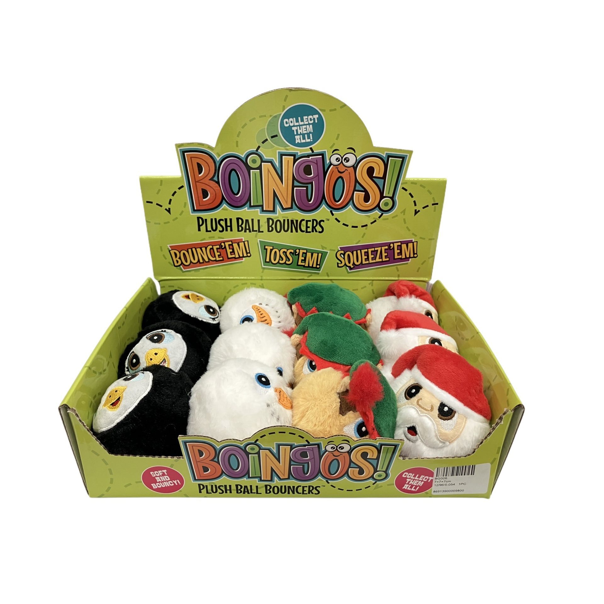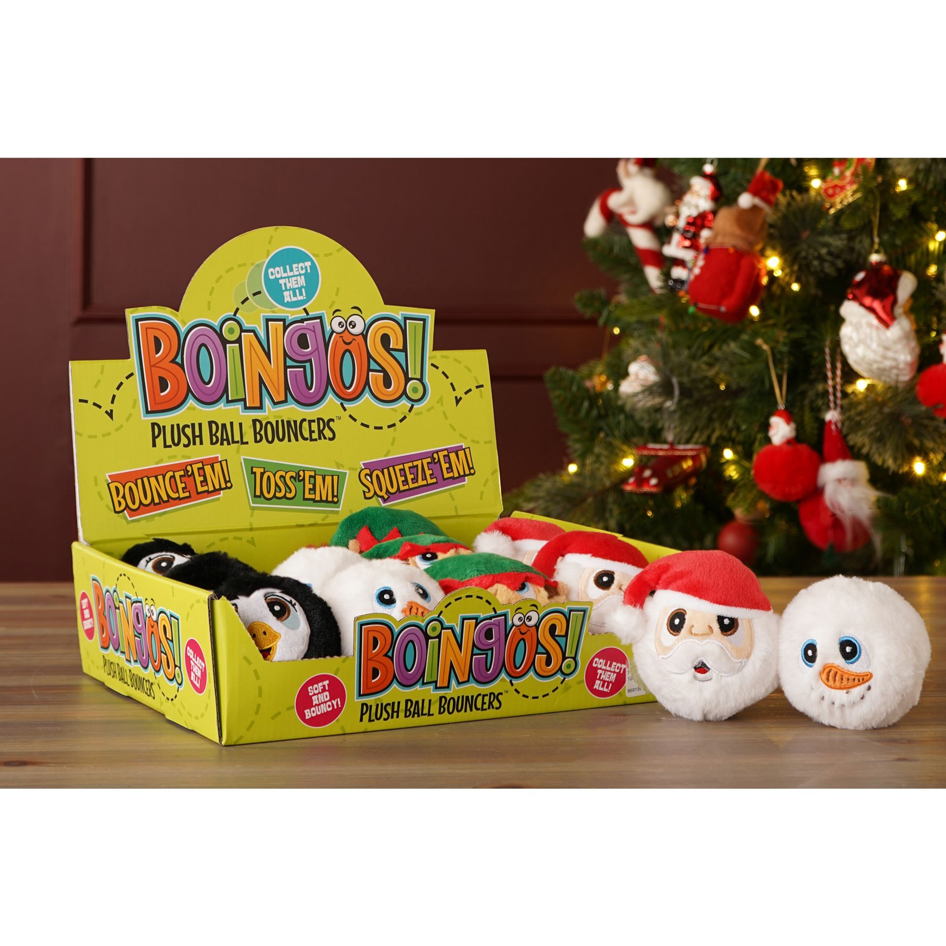 The image shows a display of Boingos! plush ball bouncers in front of a Christmas tree with decorations.